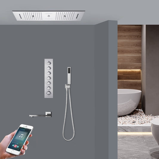 Fontana Novara Brushed Nickel Recessed Ceiling Mounted Thermostatic Rainfall LED Musical Shower System With Hand Shower and 4-Jet Body Sprays