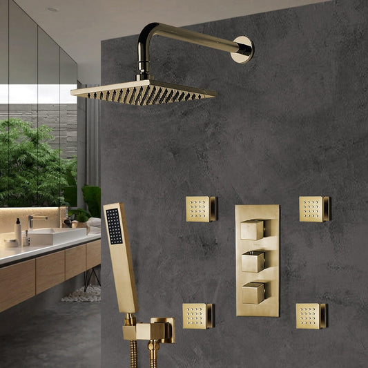 Fontana Brushed Gold Square Wall-Mounted Concealed 3-Way Valve Mixer Shower System With 4-Jet Body Sprays and Hand Shower
