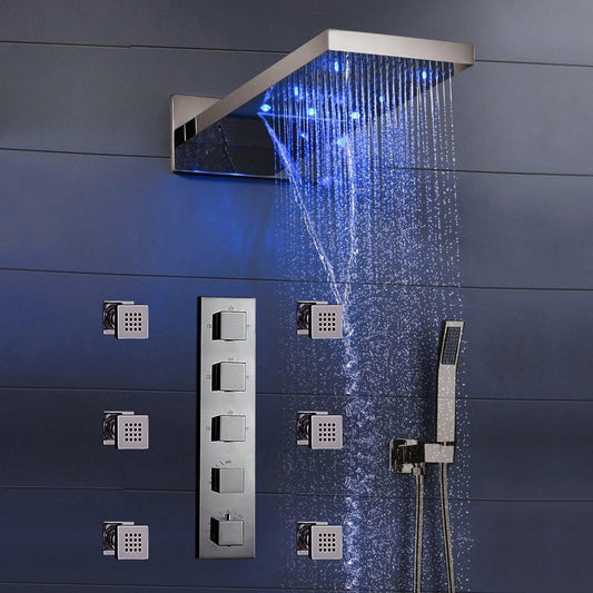 Fontana Mugla Brushed Nickel Wall-Mounted LED Thermostatic Waterfall Rain Shower System With 6-Massage Body Sprays and Hand Shower