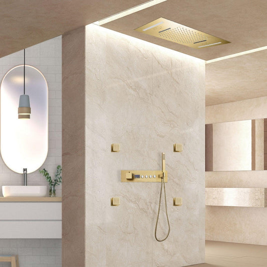 Fontana Foggia Brushed Gold Ceiling Mounted Musical Thermostatic LED Rainfall Shower System With 4-Body Jets and Hand Shower