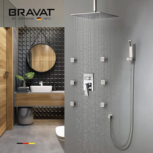 Fontana 12" Chrome Square Ceiling Mounted Thermostatic Rainfall Shower Set With 6-Jet Body Sprays and Hand Shower