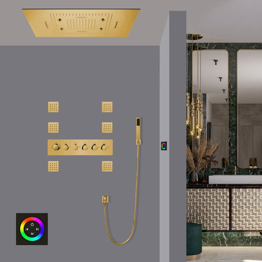 Fontana Barletta Gold Ceiling Mounted Thermostatic Touch Panel Controlled LED Musical Rainfall Waterfall Shower System With 6-Jet Body Sprays and Hand Shower