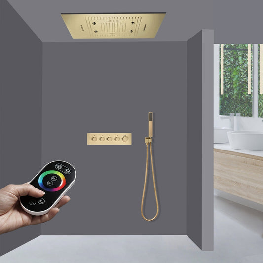Fontana Novara Brushed Gold Recessed Ceiling Mounted Thermostatic Remote Controlled Musical Mist Waterfall Rainfall Shower System With Hand Shower