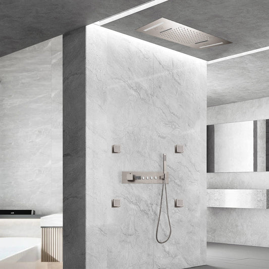 Fontana Parma Brushed Nickel Recessed Ceiling Mounted LED Thermostatic Rainfall Waterfall Shower System With 4-Body Jets and Hand Shower