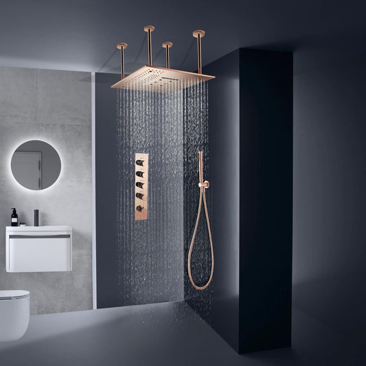 Fontana Rose Gold Ceiling Mounted Shower Arm 4-Dial Thermostatic Control Mixing Valve and Hand Shower Set