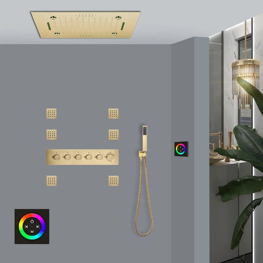 Fontana Trento Brushed Gold Recessed Celing Mounted LED Musical Touch Panel Controlled Thermostatic Rainfall Mist Waterfall Shower System With Hand Shower and 6-Body Jets