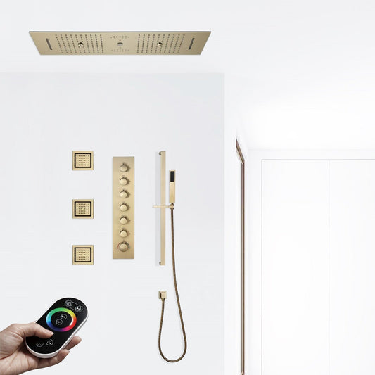 Fontana Foligno Gold Recessed Ceiling Mounted Thermostatic LED Remote Controlled Rainfall Waterfall Shower System With 6-Jet Body Sprays and Hand Shower