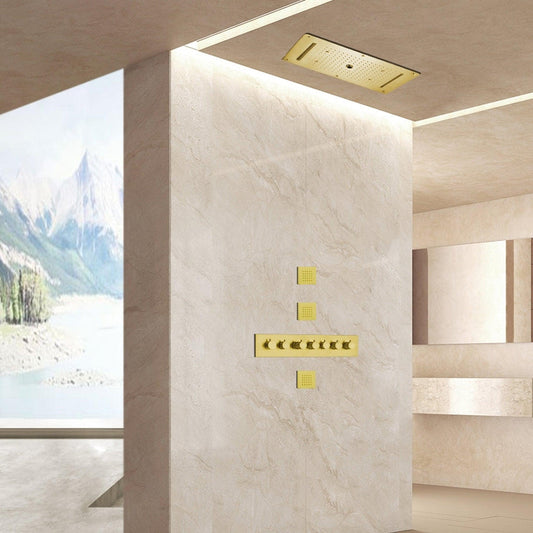 Casoria Brushed Gold Recessed LED Ceiling Mounted Waterfall Mist Rainfall Shower System With Hand Shower and 3-Jet Body Sprays