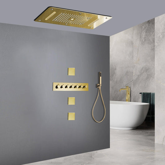 Fontana Varese Brushed Gold Recessed Ceiling Mounted Thermostatic Elegant LED Waterfall Mist Rainfall Shower System With Hand Shower and 6-Jet Body Sprays