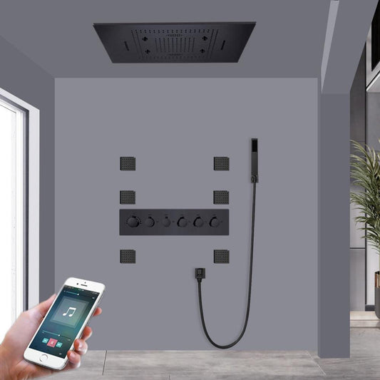 Fontana Lyon Matte Black Ceiling Mounted Thermostatic Music Smart Led Rain Shower System With Remote Control, Massage Jets and Hand Shower