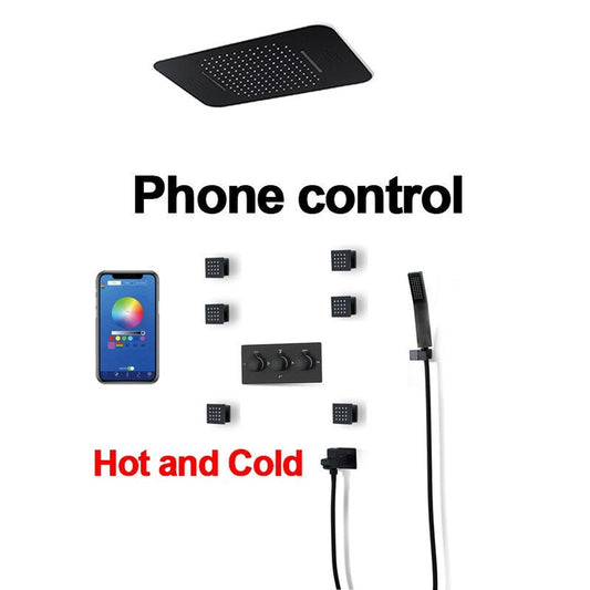 Fontana Bavaria Matte Black Ceiling Mounted Phone Controlled Thermostatic Rainfall Waterfall Shower Head Set With Massage Body Jets and Hand Sprayer