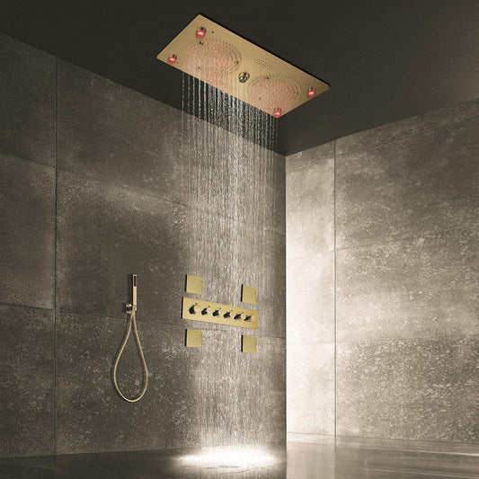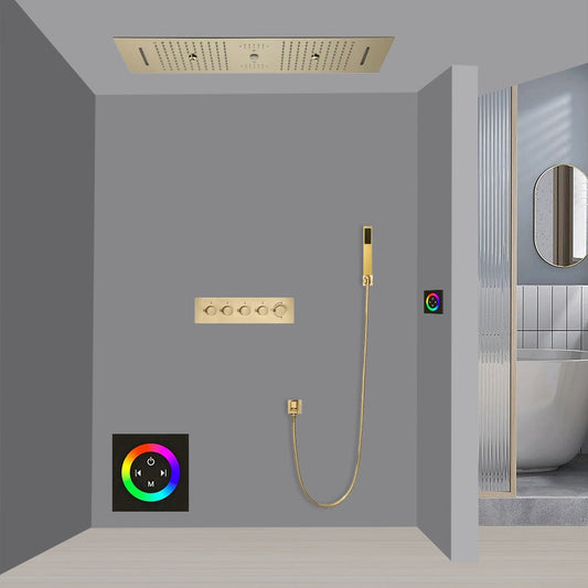 Fontana Mantua Brushed Gold Recessed Ceiling Mounted Thermostatic Musical LED Rainfall Shower System With Hand Shower and 4-Jet Body Sprays