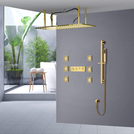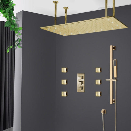 Fontana Saint Denis Brushed Gold Large Ceiling Mounted LED Rain Shower System With 6-Body Jets & Hand Shower
