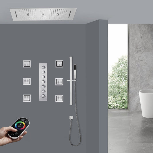 Fontana Bologna Chrome Recessed Ceiling Mounted Rainfall Waterfall Mist Remote Controlled Luxurious Thermostatic LED Musical Shower System With Hand Shower and 6-Jet Body Sprays