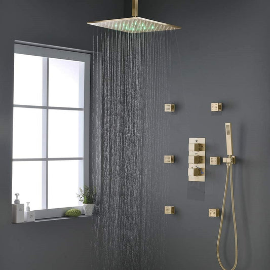 FontanaShowers Verona Creative Luxury 16" Brushed Gold Square Ceiling Mounted Thermostatic Button Mixer Rainfall Shower System With 6-Jet Body Sprays and Hand Shower