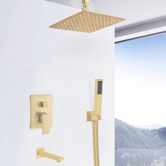 FontanaShowers Verona Creative Luxury 12" Gold Square Ceiling Mounted 3-Way Single Handle Mixer Shower System With Hand Shower and Tub Spout