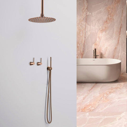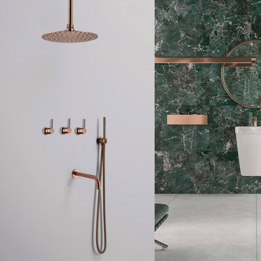 FontanaShowers Verona Creative Luxury Rose Gold Round Ceiling Mounted Solid Brass Shower Head Rainfall Shower System With Dual Mixer and Hand Shower