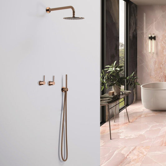 FontanaShowers Verona Creative Luxury Rose Gold Round Wall-Mounted Solid Brass Shower Head Rainfall Shower System With Dual Mixer and Hand Shower