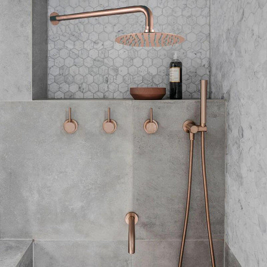 FontanaShowers Verona Creative Luxury Rose Gold Round Wall-Mounted Solid Brass Shower Head Rainfall Shower System With Triple Mixer, Hand Shower and Tub Spout