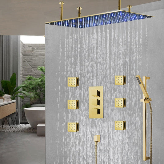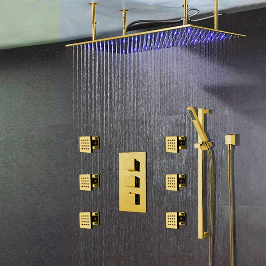 Fontana Diadema Creative Luxury Large Gold Rectangular Ceiling Mounted LED Solid Brass Shower Head Rain Shower System With 6-Jet Body Sprays and Hand Shower