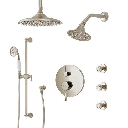 FontanaShowers Deluxe Designers 10" Brushed Nickel Round Dual Shower Head Rainfall Shower System With 3-Jet Body Sprays and Hand Shower