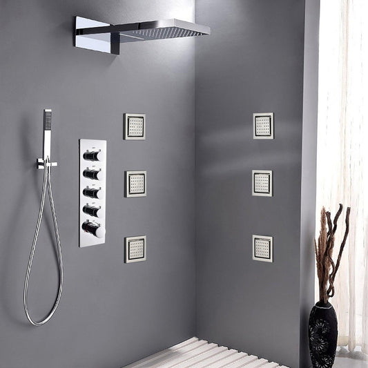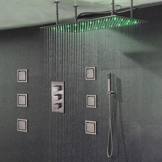 Fontana Martinique Creative Luxury Large Brushed Nickel Rectangular Ceiling Mounted LED Solid Brass Shower Head Rain Shower System With 6-Jet Body Sprays and Hand Shower