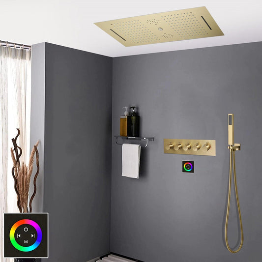 Fontana Genoa Brushed Gold Rectangular Recessed Ceiling Mounted Shower Head Rainfall & Waterfall LED Shower System With Touch Panel Control and Hand Shower