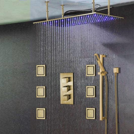 Fontana Martinique Creative Luxury Large Brushed Gold Rectangular Ceiling Mounted LED Solid Brass Shower Head Rain Shower System With 6-Jet Body Sprays and Hand Shower