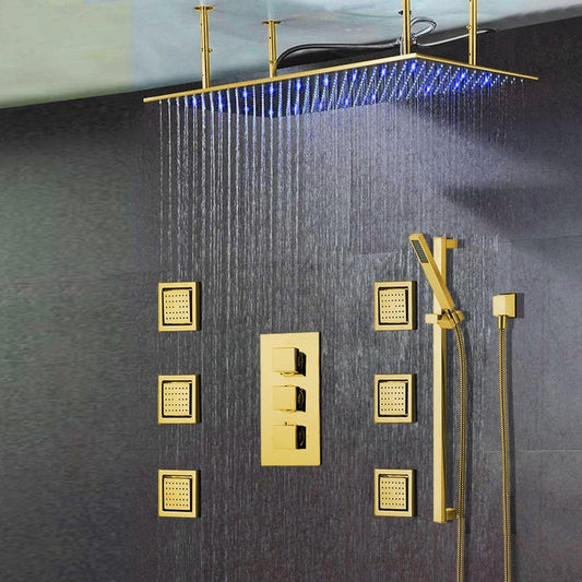 Fontana Martinique Creative Luxury Large Gold Rectangular Ceiling Mounted LED Solid Brass Shower Head Rain Shower System With 6-Jet Body Sprays and Hand Shower