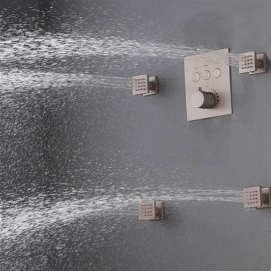 FontanaShowers Creative Luxury 20" Brushed Nickel Square Ceiling Mounted Rainfall Shower System With Thermostat Mixer, 6-Jet Body Sprays And Hand Shower