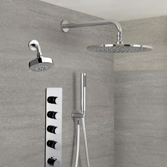 FontanaShowers Designers Creative Luxury 12" Chrome Round Wall-Mounted Dual Shower Head Rainfall Shower System With Hand Shower and Triple Handle Mixer
