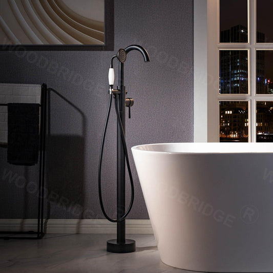 WoodBridge 48" White Acrylic Freestanding Rectangular Air Bath Bathtub With Pre-molded Seat, Matte Black Pop-Up Drain, Overflow, F0006MBVT Tub Filler and Caddy Tray