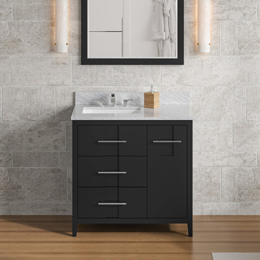 Hardware Resources Jeffrey Alexander Katara 36" Black Freestanding Vanity With Left Offset, White Carrara Marble Vanity Top, Backsplash and Rectangle Undermount Sink