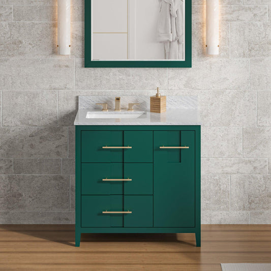 Hardware Resources Jeffrey Alexander Katara 36" Green Freestanding Vanity With Left Offset, White Carrara Marble Vanity Top, Backsplash and Rectangle Undermount Sink