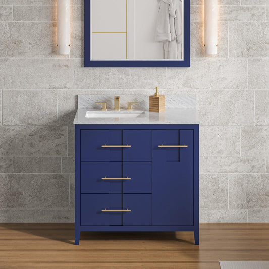 Hardware Resources Jeffrey Alexander Katara 36" Hale Blue Freestanding Vanity With Left Offset, White Carrara Marble Vanity Top, Backsplash and Rectangle Undermount Sink