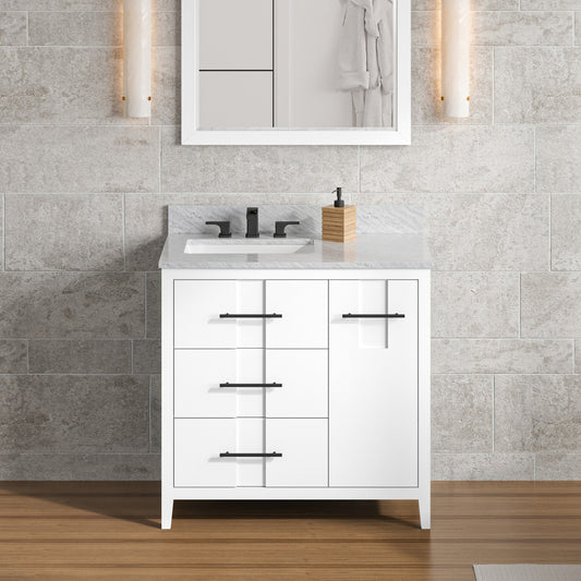 Hardware Resources Jeffrey Alexander Katara 36" White Freestanding Vanity With Left Offset, White Carrara Marble Vanity Top, Backsplash and Rectangle Undermount Sink