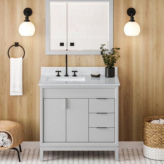 Hardware Resources Jeffrey Alexander Theodora 36" Grey Freestanding Vanity With Left Offset, White Carrara Marble Vanity Top, Backsplash and Rectangle Undermount Sink