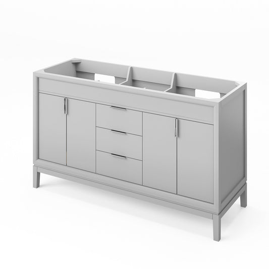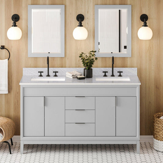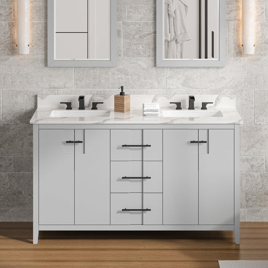 Hardware Resources Jeffrey Alexander Katara 60" Grey Freestanding Vanity With Double Bowl, Calacatta Vienna Quartz Vanity Top, Backsplash and Rectangle Undermount Sink