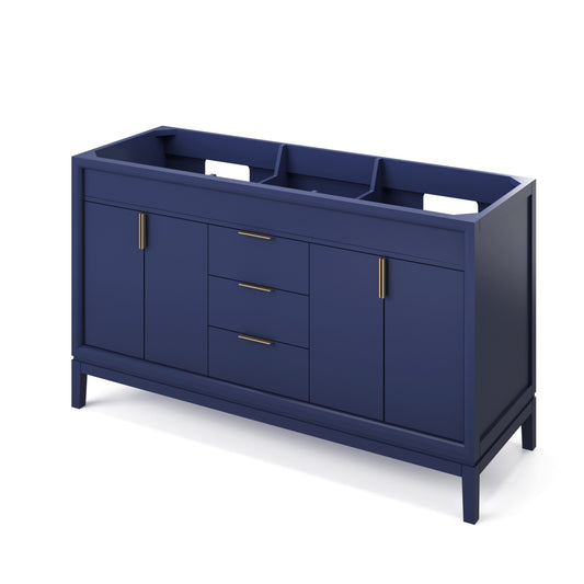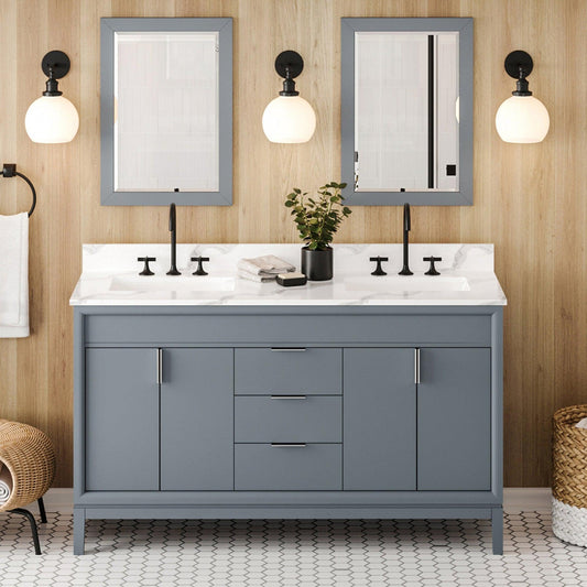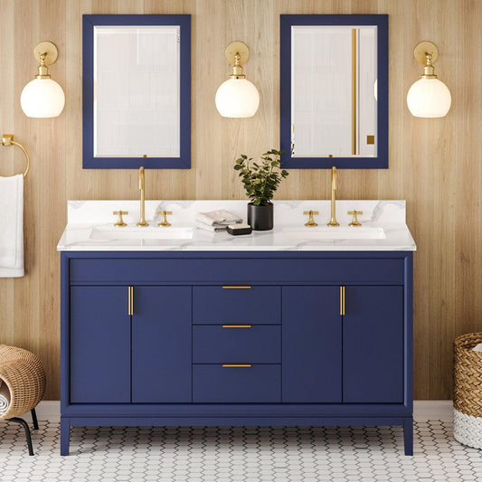 Hardware Resources Jeffrey Alexander Theodora 60" Blue Steel Freestanding Vanity With Double Bowl, Calacatta Vienna Quartz Vanity Top, Backsplash and Rectangle Undermount Sink