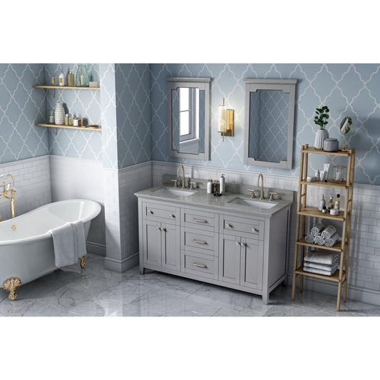 Hardware Resources Jeffrey Alexander Chatham 60" White Freestanding Vanity With Double Bowl, Steel Gray Cultured Marble Vanity Top, Backsplash and Rectangle Undermount Sink