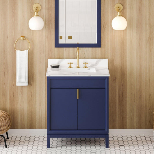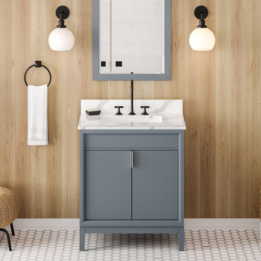 Hardware Resources Jeffrey Alexander Theodora 30" Blue Steel Freestanding Vanity With Calacatta Vienna Quartz Vanity Top, Backsplash and Rectangle Undermount Sink