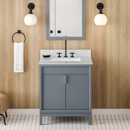 Hardware Resources Jeffrey Alexander Theodora 30" Blue Steel Freestanding Vanity With White Carrara Marble Vanity Top, Backsplash and Rectangle Undermount Sink