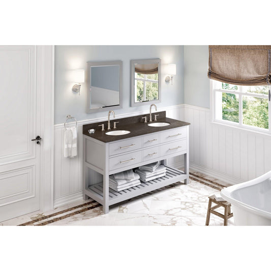 Hardware Resources Jeffrey Alexander Wavecrest 60" Gray Freestanding Vanity With Double Bowl, Black Granite Vanity Top, Backsplash and Oval Undermount Sink