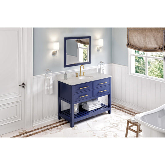 Hardware Resources Jeffrey Alexander Wavecrest 48" Hale Blue Freestanding Vanity With Calacatta Vienna Quartz Vanity Top, Backsplash and Oval Undermount Sink
