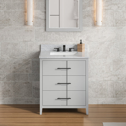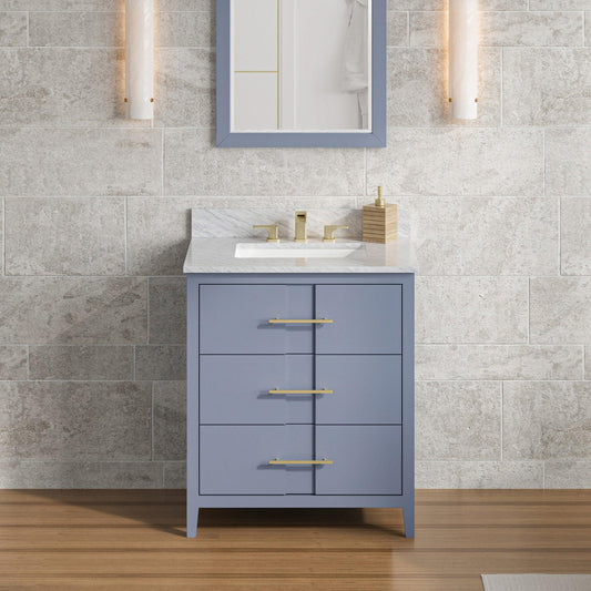 Hardware Resources Jeffrey Alexander Katara 30" Grey Freestanding Vanity With White Carrara Marble Vanity Top, Backsplash and Rectangle Undermount Sink