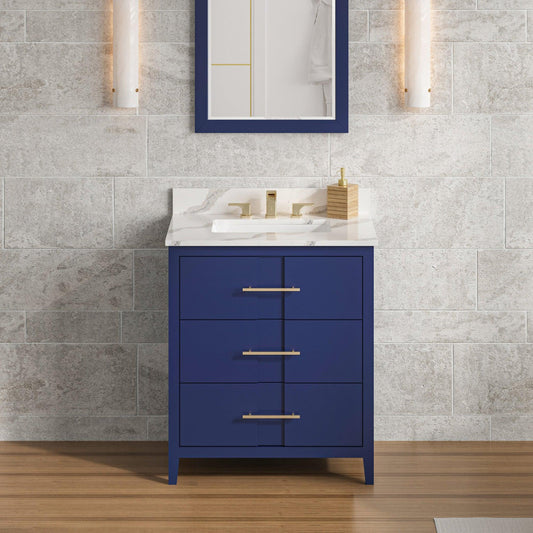Hardware Resources Jeffrey Alexander Katara 30" Hale Blue Freestanding Vanity With Calacatta Vienna Quartz Vanity Top, Backsplash and Rectangle Undermount Sink