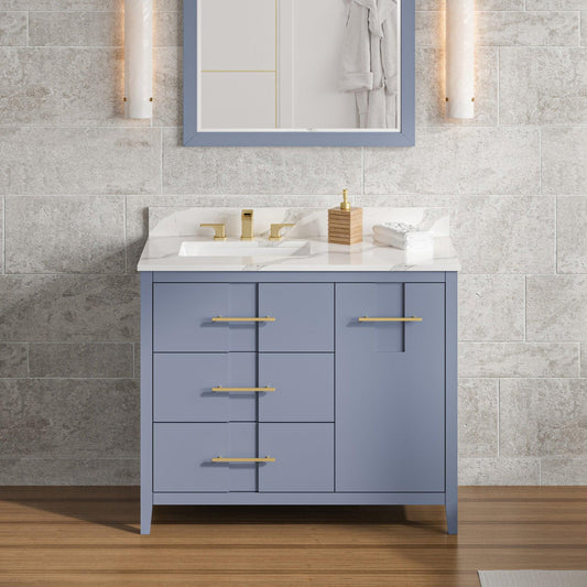 Hardware Resources Jeffrey Alexander Katara 42" Blue Steel Freestanding Vanity With Left Offset, Calacatta Vienna Quartz Vanity Top, Backsplash and Rectangle Undermount Sink