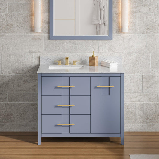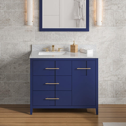 Hardware Resources Jeffrey Alexander Katara 42" Hale Blue Freestanding Vanity With Left Offset, White Carrara Marble Vanity Top, Backsplash and Rectangle Undermount Sink