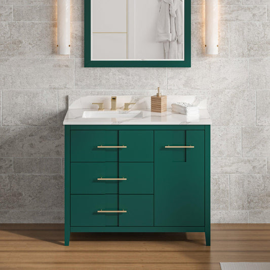 Hardware Resources Jeffrey Alexander Katara 42" Green Freestanding Vanity With Left Offset, Calacatta Vienna Quartz Vanity Top, Backsplash and Rectangle Undermount Sink