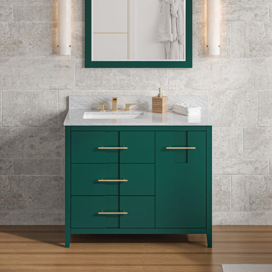 Hardware Resources Jeffrey Alexander Katara 42" Green Freestanding Vanity With Left Offset, White Carrara Marble Vanity Top, Backsplash and Rectangle Undermount Sink